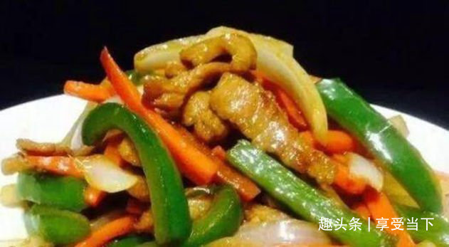 2、锅置火上烧热倒油,入肉丝煸至肉色发白盛出,再起锅入葱姜煸香,入胡萝卜翻炒至六层熟时下圆椒再翻炒一会,加酱油,盐,一点白糖提鲜,最后加入洋葱翻炒,入鸡精,下蒜末炒均匀,淋适量水淀粉勾芡,再滴几滴香油,即可
