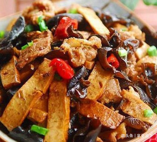 4、下胡萝卜翻炒至稍软,下黑木耳和香干,翻炒均匀后烹入少量盐和酱油炒匀。