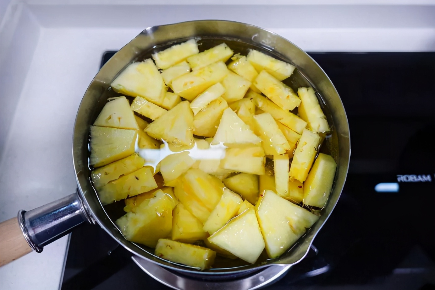 ③、将菠萝块放进去煮,大概需要煮三分钟左右,菠萝块和冷水一起下锅,大火煮开以后继续煮3分钟左右。煮好之后将菠萝捞出来控水。这样就可以吃了。