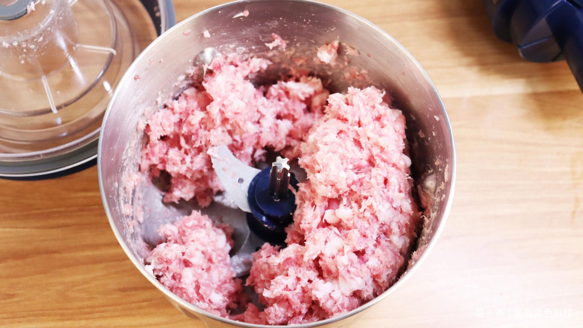 这款绞肉机的使用特别的简单只要轻轻一按,几秒钟就搅碎成功。为了挑战一下这个绞肉机的刀力如何,我专门买了一块五花肉来测试一下,把买回来的五花肉,洗净去皮切块,根据肉量选择一个合适的不锈钢盆,盆的底部有个孔可把料理刀插在上面,再放入肉块,再盖上盆盖,再把主机有孔的一端对准盆盖,准备工作就完成了。