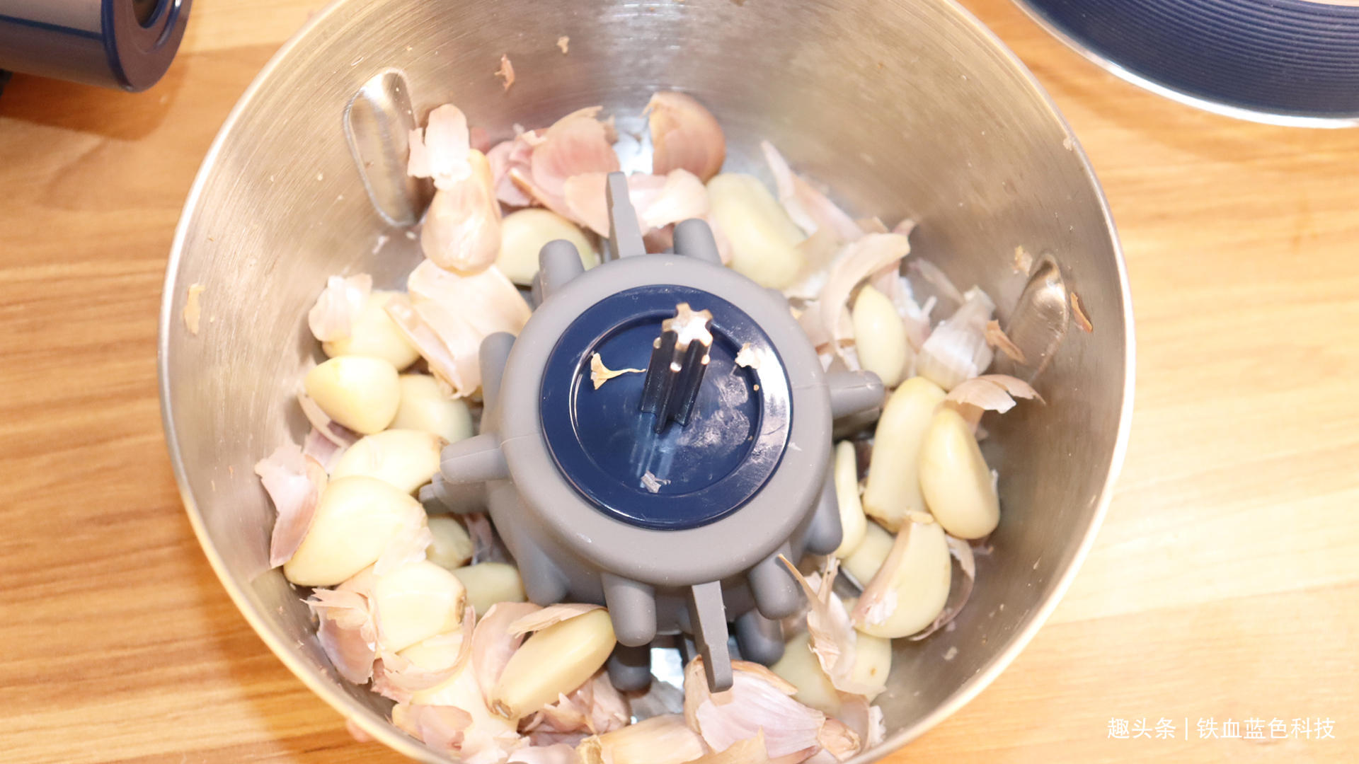 看一下剥蒜器,蒜味不沾手360°环绕剥蒜支架,增强摩擦力。剥蒜不辣手不沾味,蒜粒完整无损。尝试一下它的剥蒜功能,找个不锈钢盆,放入搅蒜棒,再把一骨碌的大蒜不刨皮,弄成一半一半的,放入盆里,同理盖上盆盖,和主机,几秒钟一个个大蒜就从外衣里,破蛹而出。