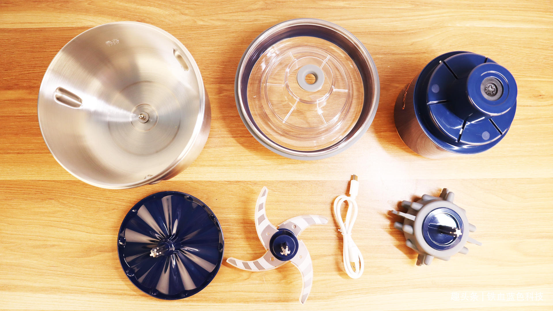 第一排从左到右一次为,不锈钢盆3个分为大小不同的大,中,小,三个,碗盖,主机,第二排为打蛋棒,料理刀,充电线,搅蒜棒,说明书,防滑垫。看看这大大小小的真不老少。