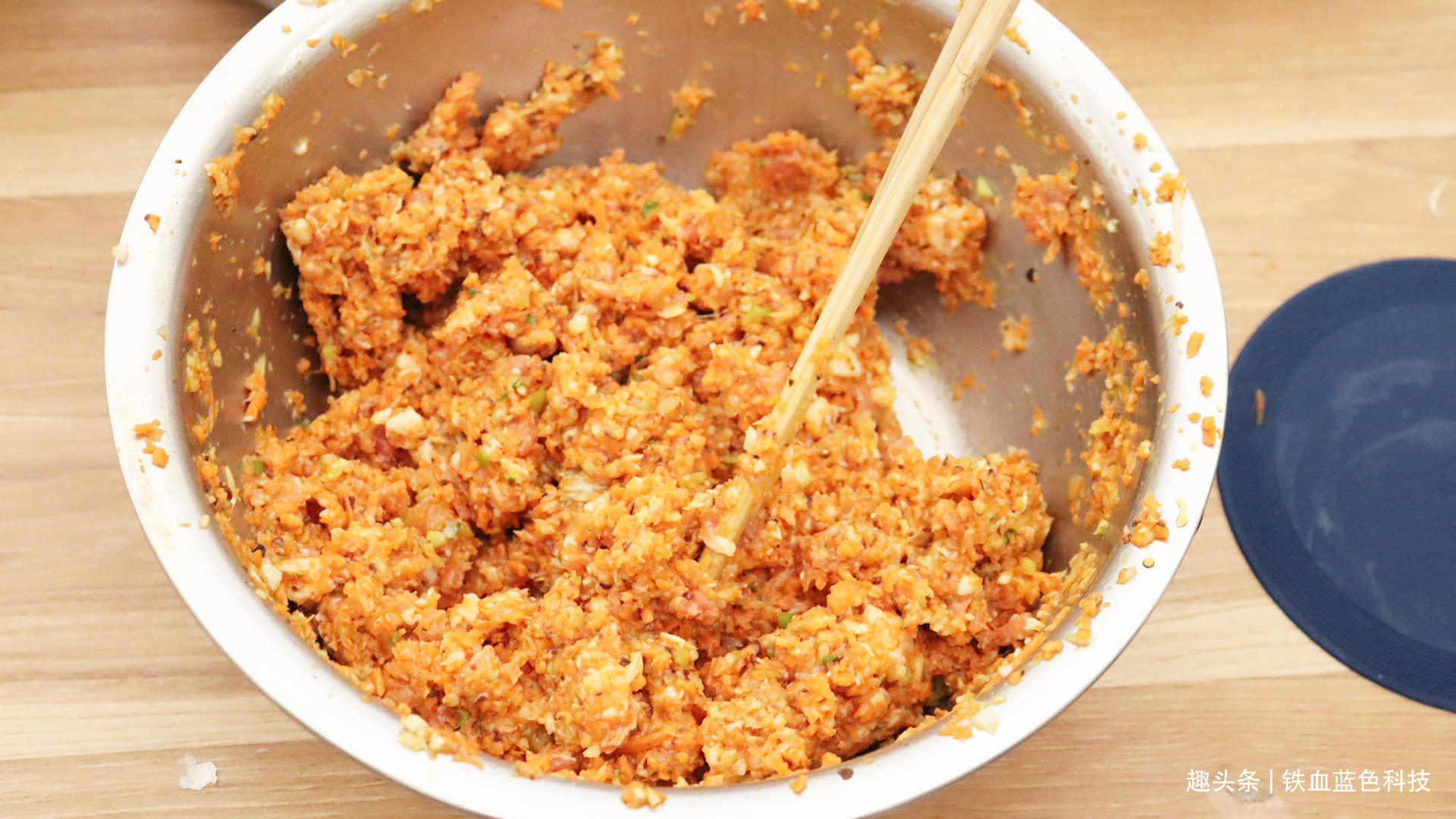 把胡萝卜去皮擦成丝,在另一个不锈钢盆里拆上料理刀,倒入胡萝卜丝,盖上盆盖,带上主机,按II键,同样的方法按几秒钟,休息一会再按,很快你就从盆盖里看到打成睿渣了,在打了点葱,馅料就准备好了。包饺子或者包子都可以。