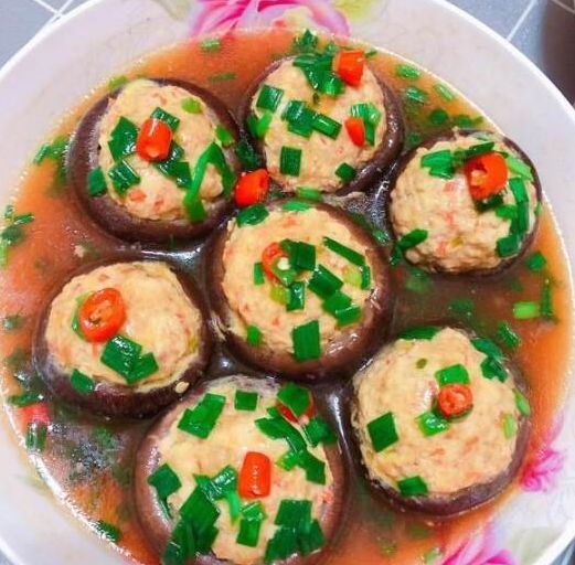 4、将做好的豆腐肉馅酿在香菇中,将香菇整齐的码在盘子中