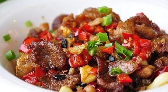 3、先把干辣椒、姜片、蒜片放油内爆香,倒入胗花,翻炒均匀,加入烹饪黄酒、白酒、生抽、盐、少许糖,大火翻炒。