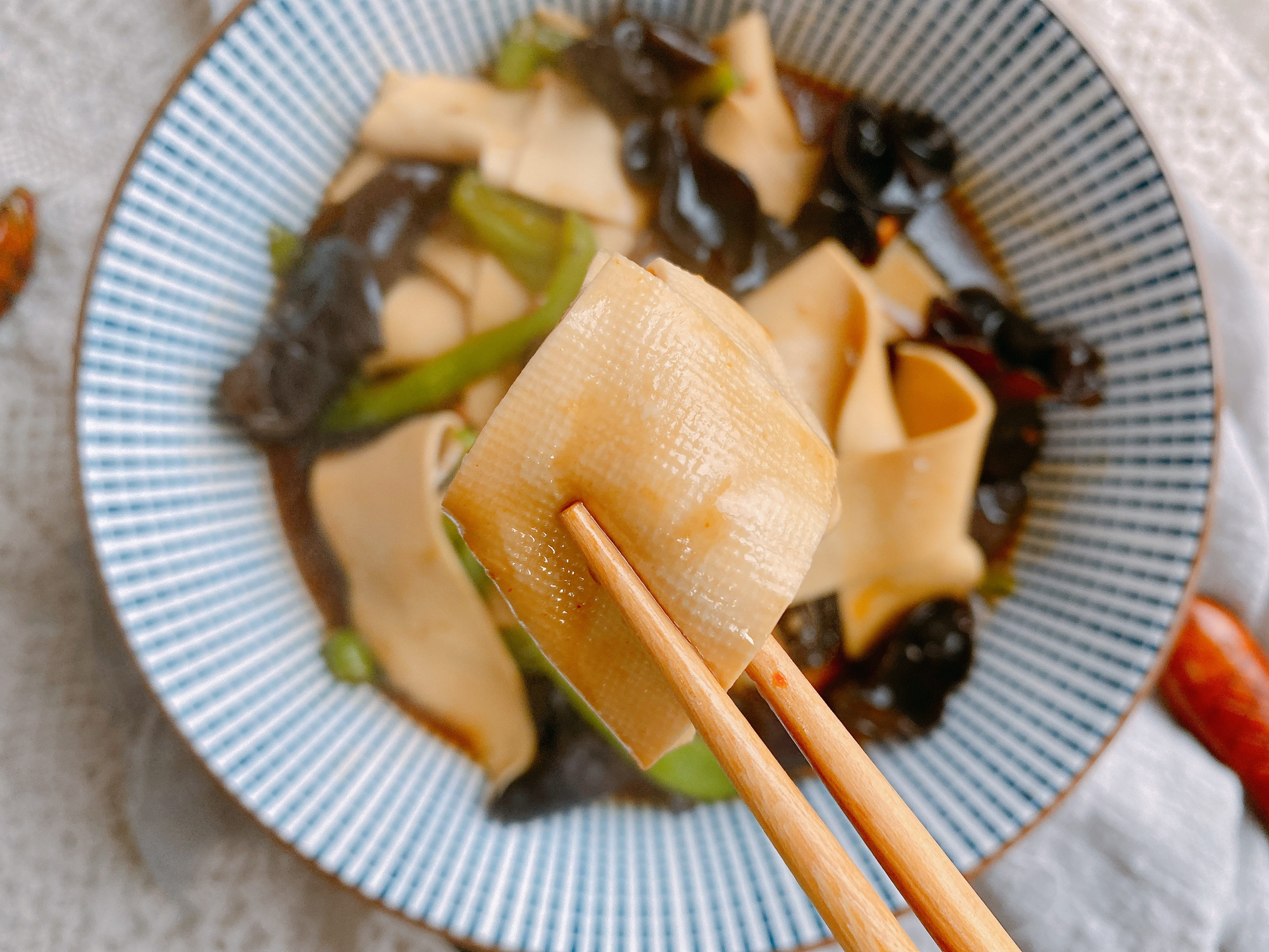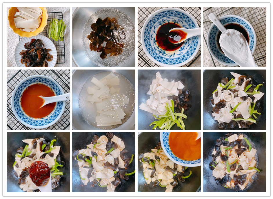 【原材料】木耳适量、千张2张、青椒1个、豆瓣酱、生抽、老抽、蚝油、淀粉、食用油;