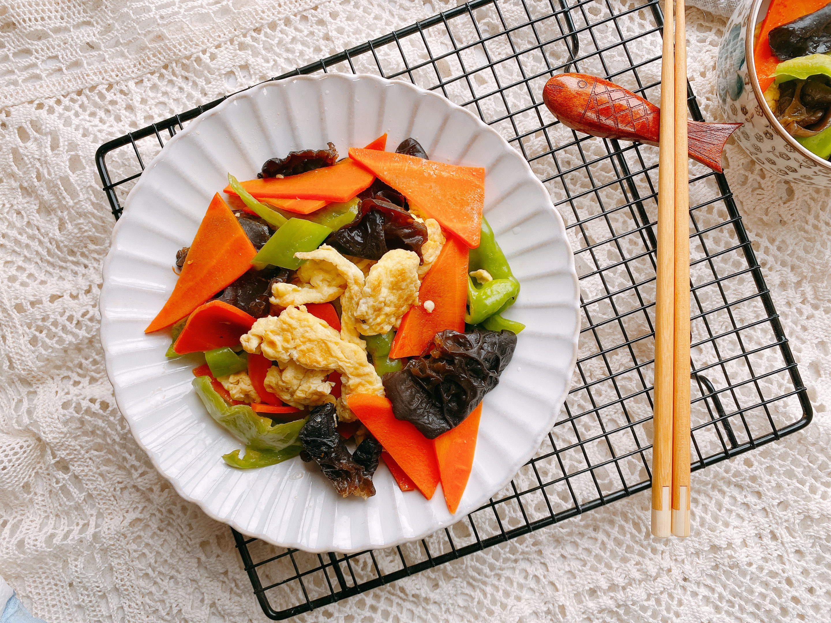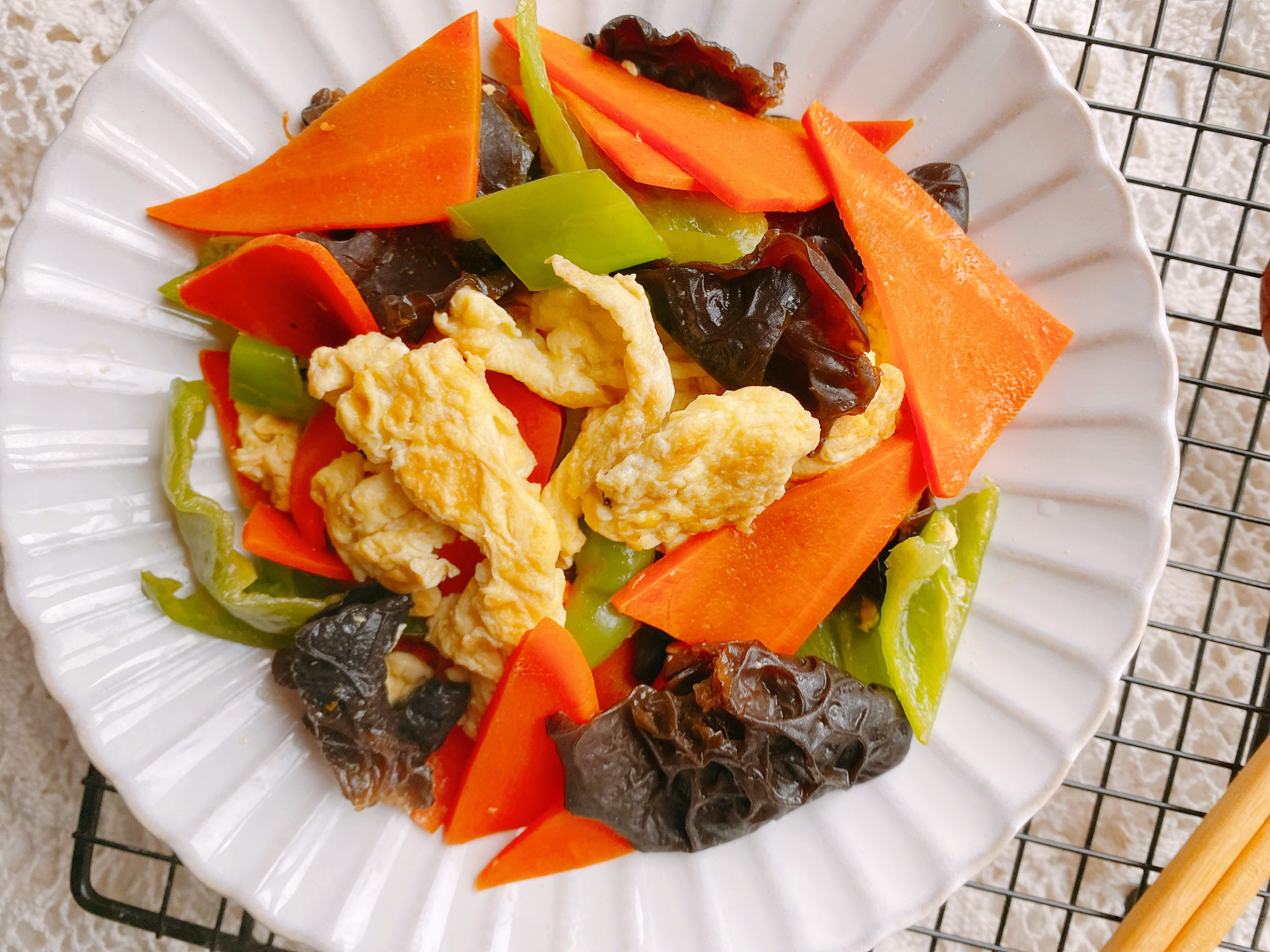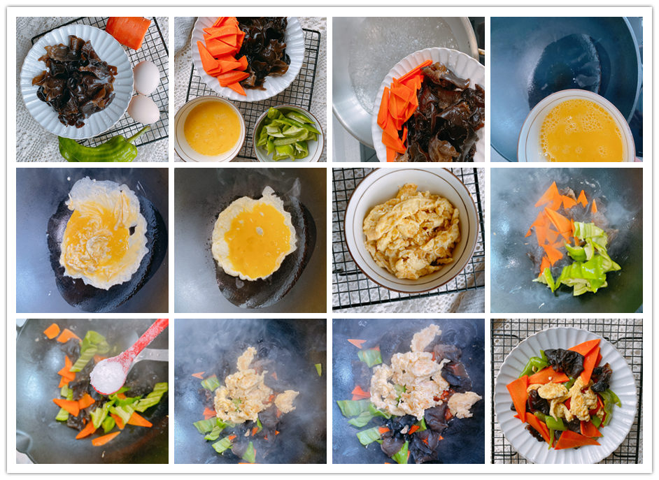 【原材料】黑木耳适量、鸡蛋2个、青椒一个、胡萝卜半个;