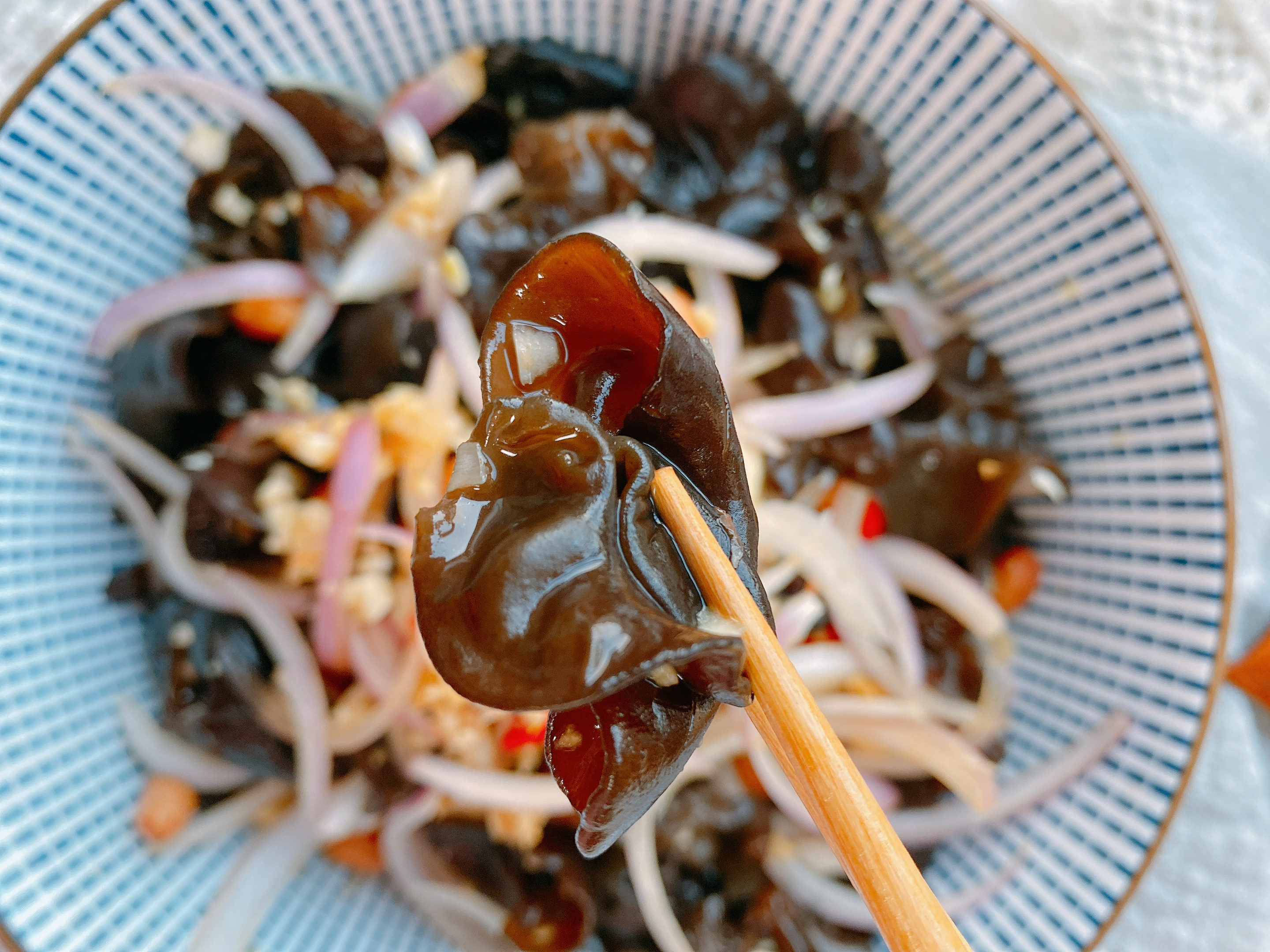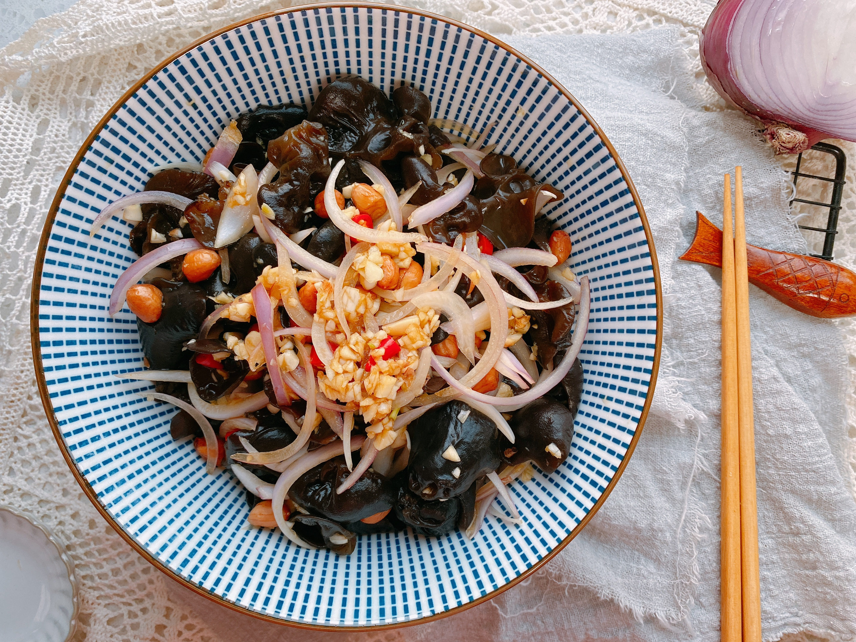 【原材料】黑木耳适量、花生米、洋葱、小米辣、大蒜、食盐、生抽、蚝油、香油;