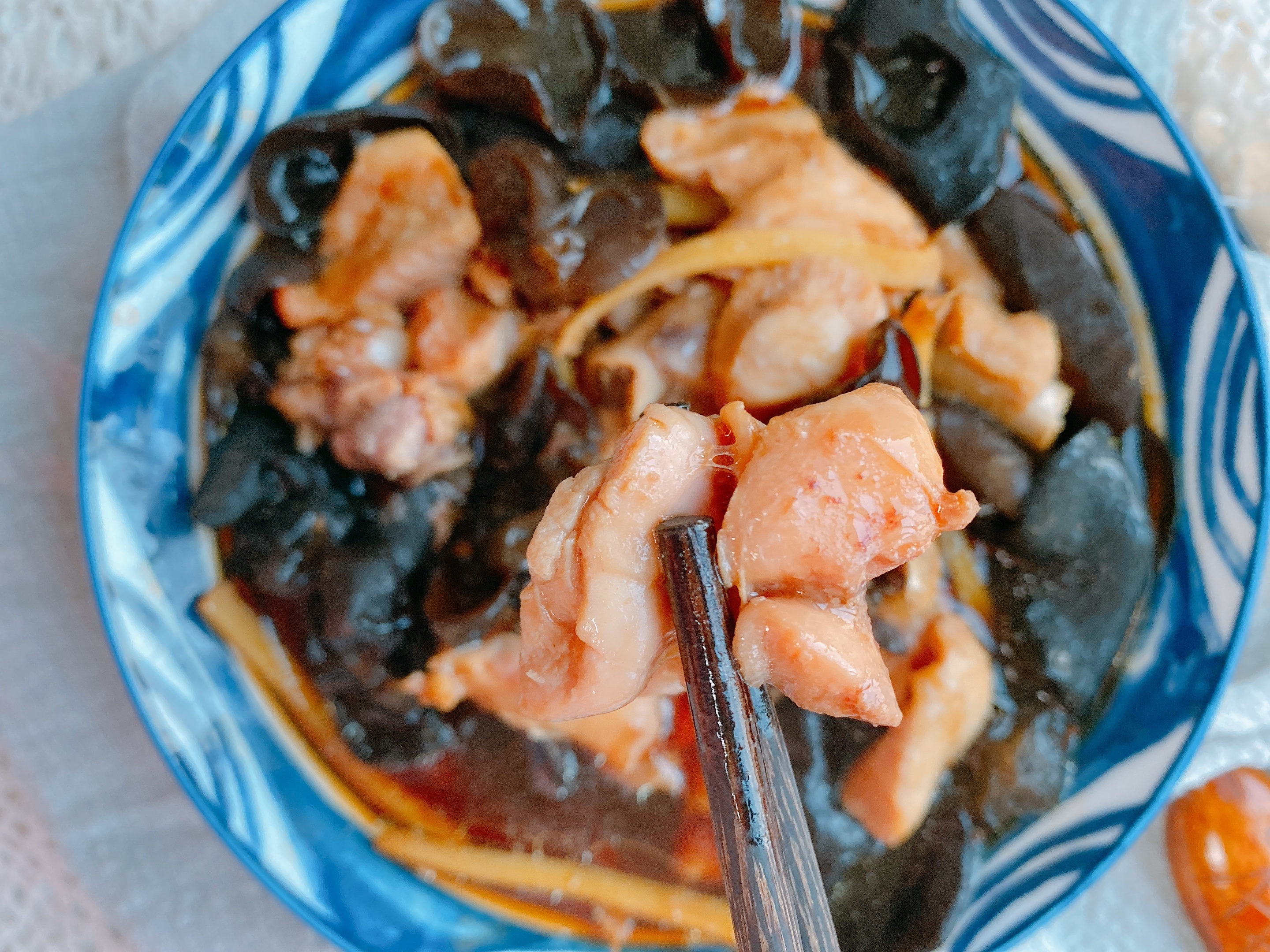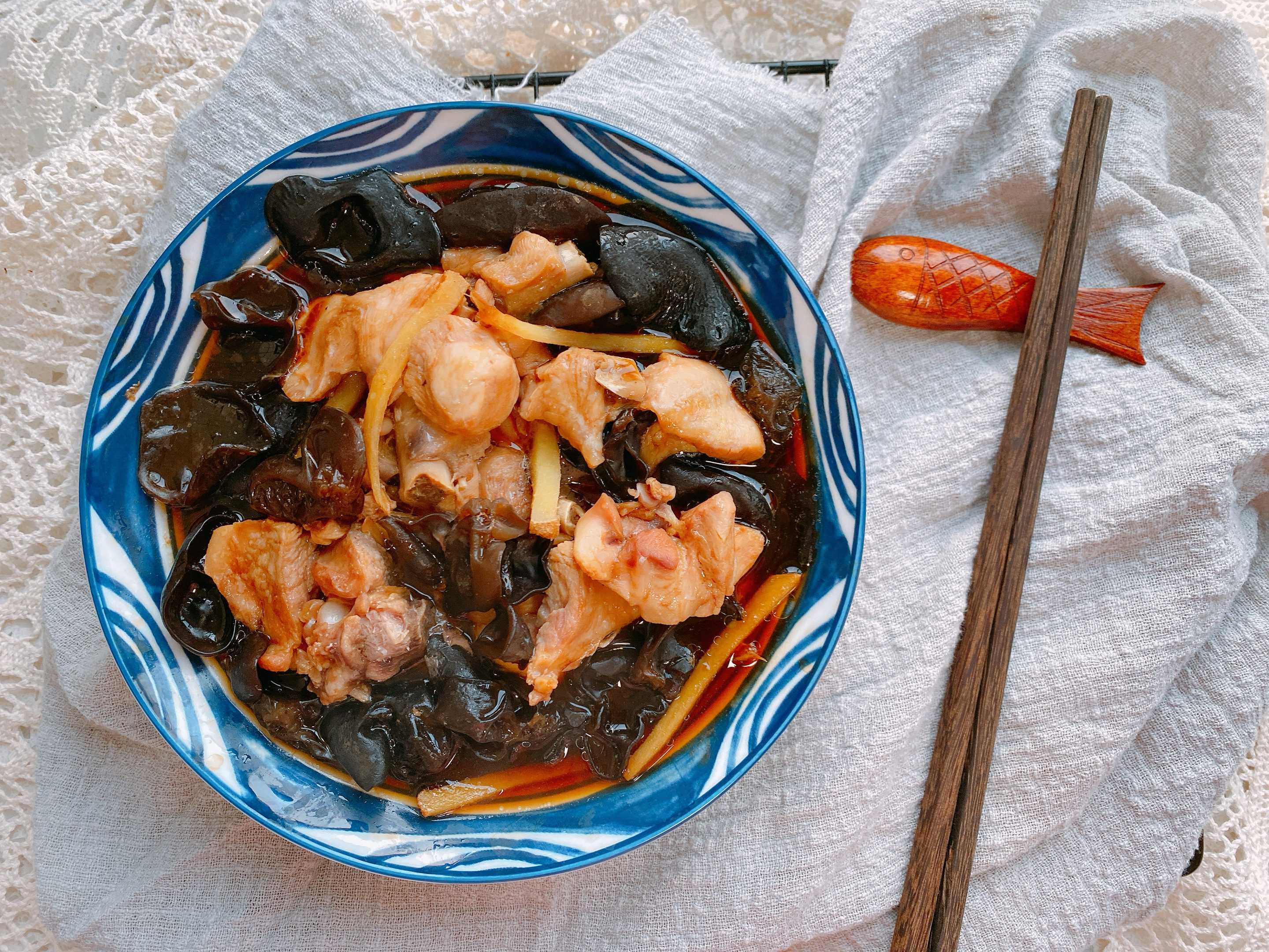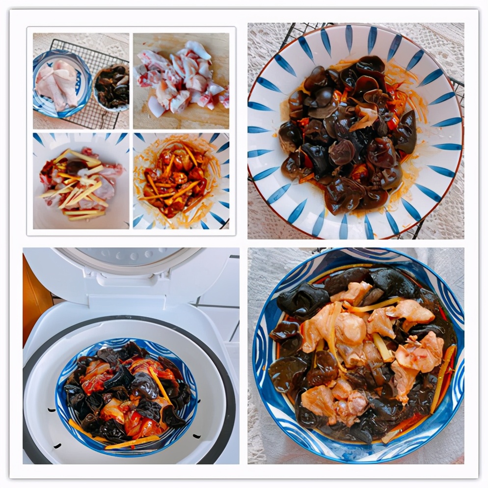 【原材料】黑木耳适量、鸡腿2个、生姜、食盐、生抽、蚝油;