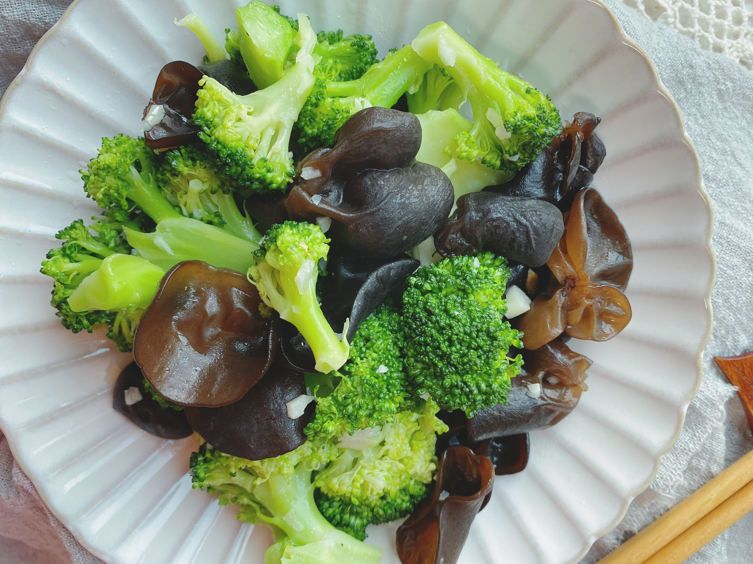 【原材料】木耳适量、西兰花、蒜末、食盐、食用油;