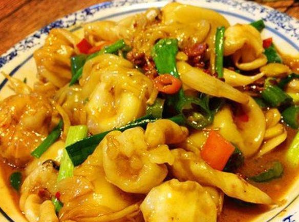 4、将准备好的鱼泡倒入锅内大火继续翻炒(鱼泡一定要切开,不然下入油锅会爆开),鱼泡含有大量的胶原蛋白,所以在炒制的时候渗出一些黏液很正常