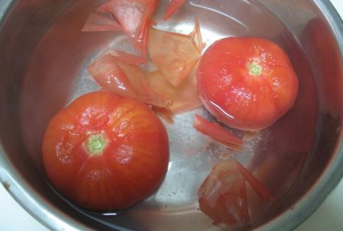 西红柿表面洗净,锅里加水烧热,把西红柿放进去,等到皮裂开捞出,趁热将外皮去掉。皮去掉可以使这道更好看。