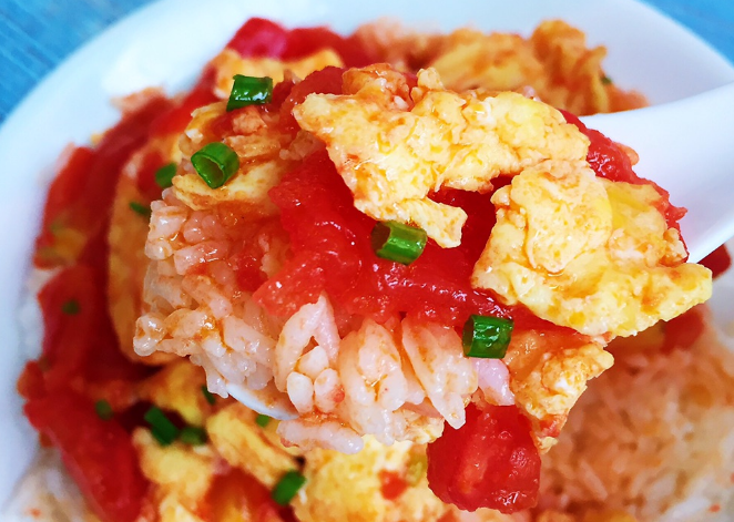 这样西红柿炒鸡蛋就做好了,汤汁浓稠鲜甜微酸,鸡蛋软嫩鲜香,浇在米饭上非常好吃。