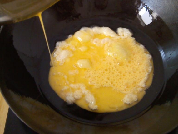 3、不能用凉锅炒鸡蛋,否则鸡蛋会粘锅,造成鸡蛋口感差,形状难看,甚至焦糊,正确做法是先把锅烧热,再到油进去,润锅后差不多有六七成热了倒进鸡蛋,快速翻炒成大块,这样做出的鸡蛋更软嫩。