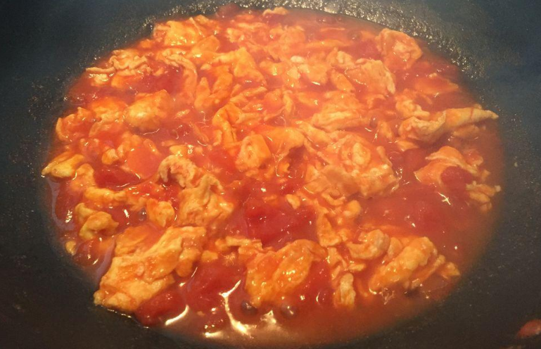 4、鸡蛋再次入锅前,要给锅内加少许热水,这样一来鸡蛋入锅后充分吸收水分,就会更软嫩了,还和西红柿汁水相互融合的更紧密,变得好吃。