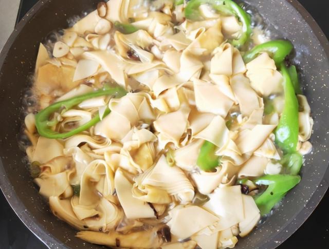 1、豆腐皮直接炒可能会有些干硬,所以我选择事先将其焯水,将豆腐皮煮软,这样炒菜味道更好,而且还特别容易吸收酱汁,味道更足,豆腐皮不要切得太细,稍微粗一点更加有嚼感;