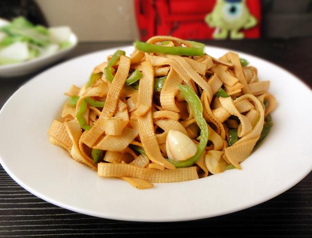 青椒豆腐皮炒肉的做法: