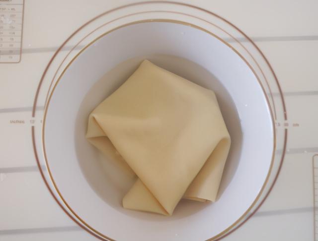 制作过程:第一步,豆腐皮2张,放开水锅中焯烫下,捞出来后过一遍凉水,将豆腐皮快速降温变凉,豆腐皮控水后切成丝,可以稍微粗一点要粗细均匀;