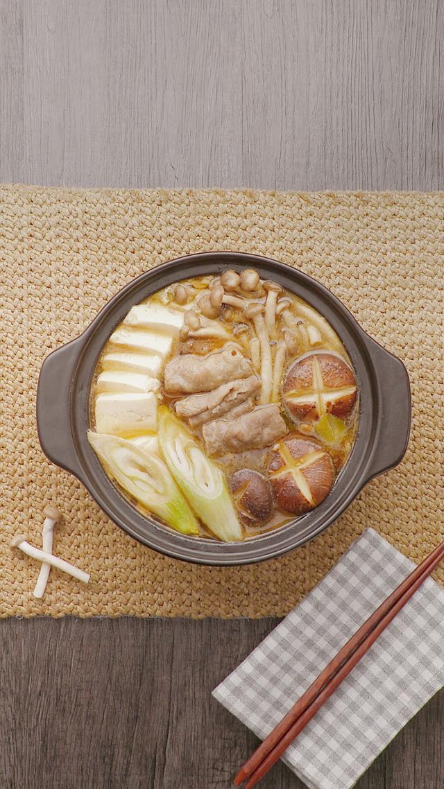 锅中依次放入大白菜、豆腐、蟹味菇、香菇,倒入调制好的酱汁与清水,大火煮沸。