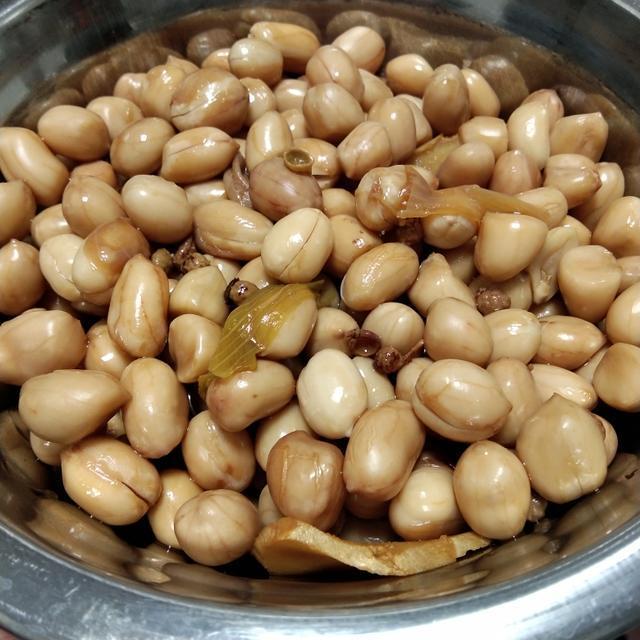 花生250克;葱1段;姜2片;花椒7.8粒;大料1个;香叶2片;桂皮1小块;冰糖1小把;生抽2勺;老抽2勺;盐50克