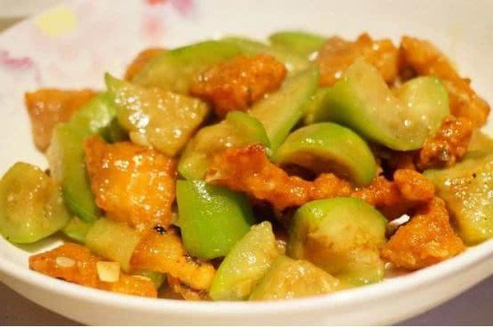 7.丝瓜炒至变色后加入炸好的猪肉,翻炒几下