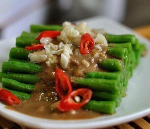 食材: 鲜豆角五两 芝麻酱二两 精盐五钱 味精十粒花椒油五钱 姜末三钱