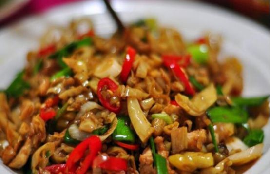4、下炸好的扇贝和青红椒节,加盐、味精、鸡精、香油和花椒油调味,撒炸花生即可