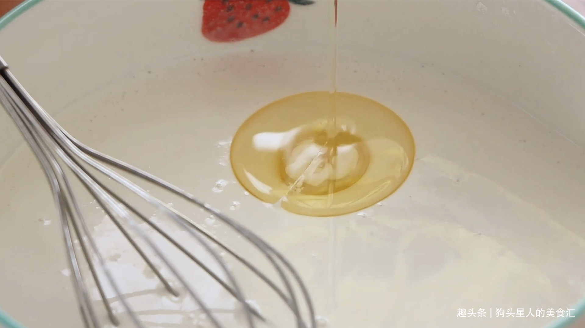 3.加入15毫升的食用油,搅拌均匀。食用油最好使用没有味道的油,黄油也可以。不建议用花生油之类的,味道太重了。