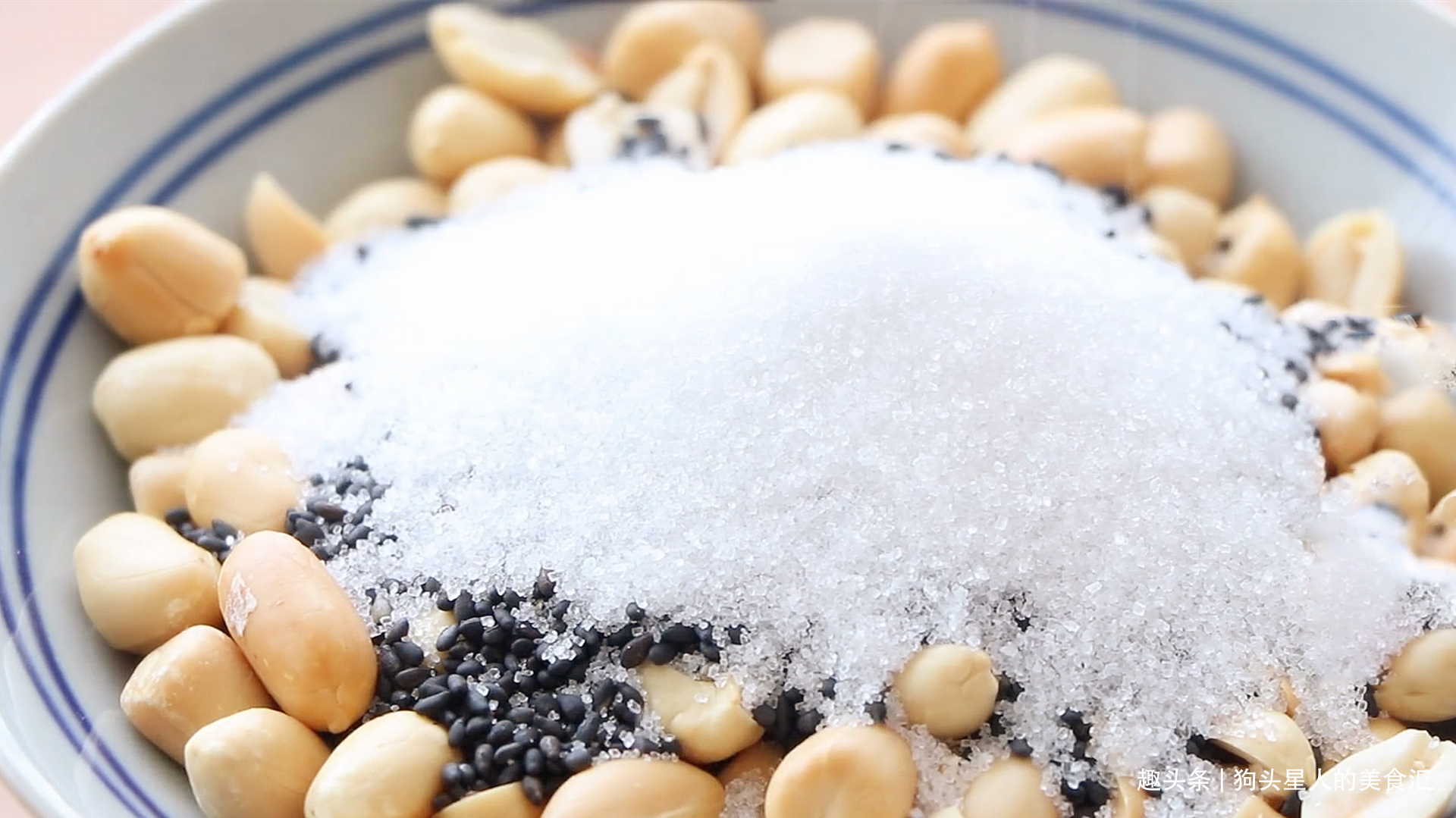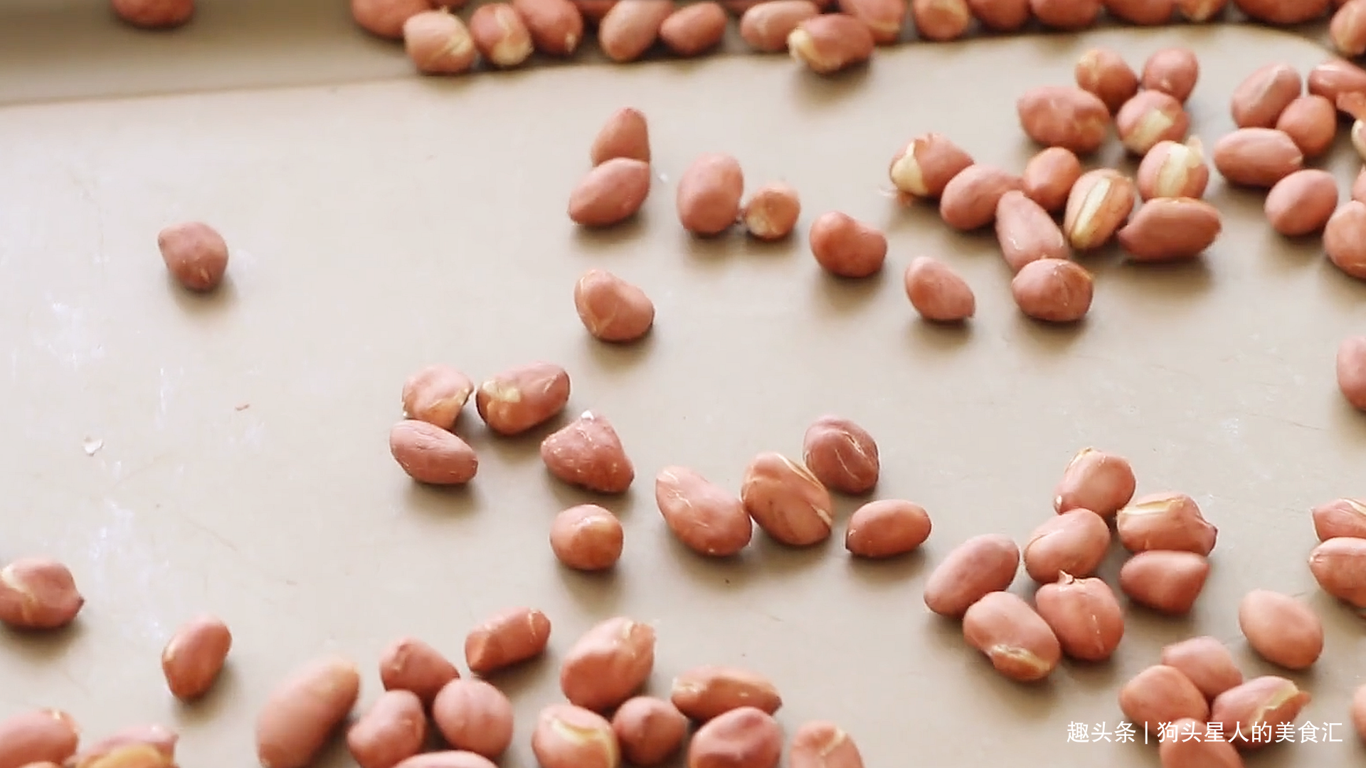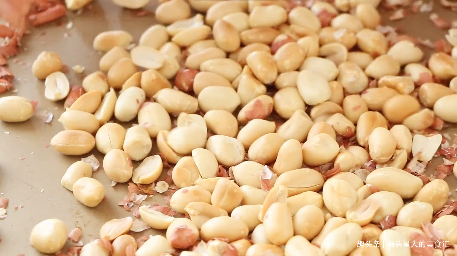 5.蒸的时候做馅料。花生米烤一下,或者入锅干炒,炒到表皮开裂,花生米外衣能轻松捻下来即可。