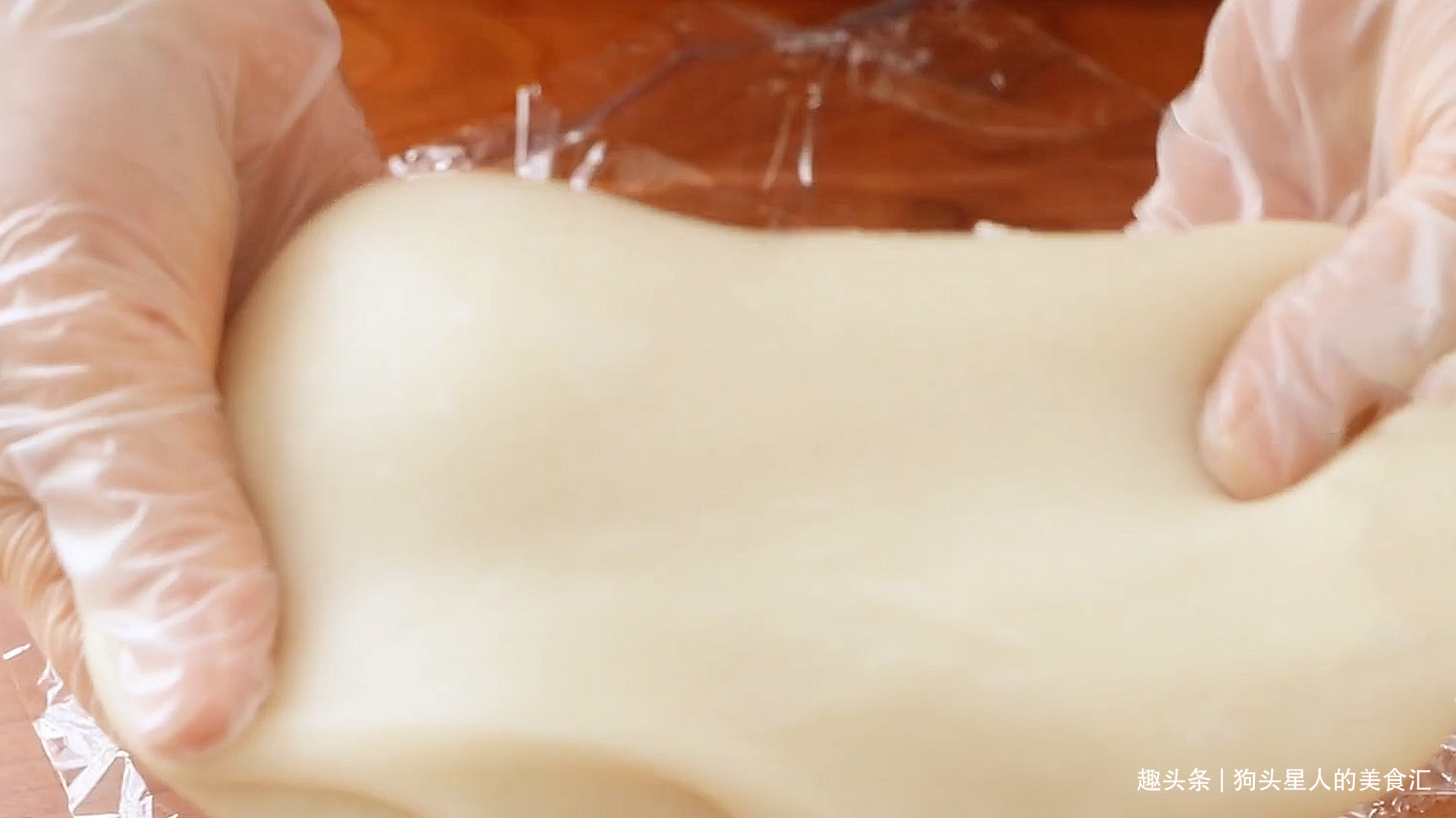 10.揉到拉一下能拉很长的长度就可以,如果拉一下就断就不行,再揉一揉,揉出劲,吃着才弹牙。刚开始揉的时候会很黏,一直揉它就会变得光滑不粘手,温度变得温热就可以揉了。