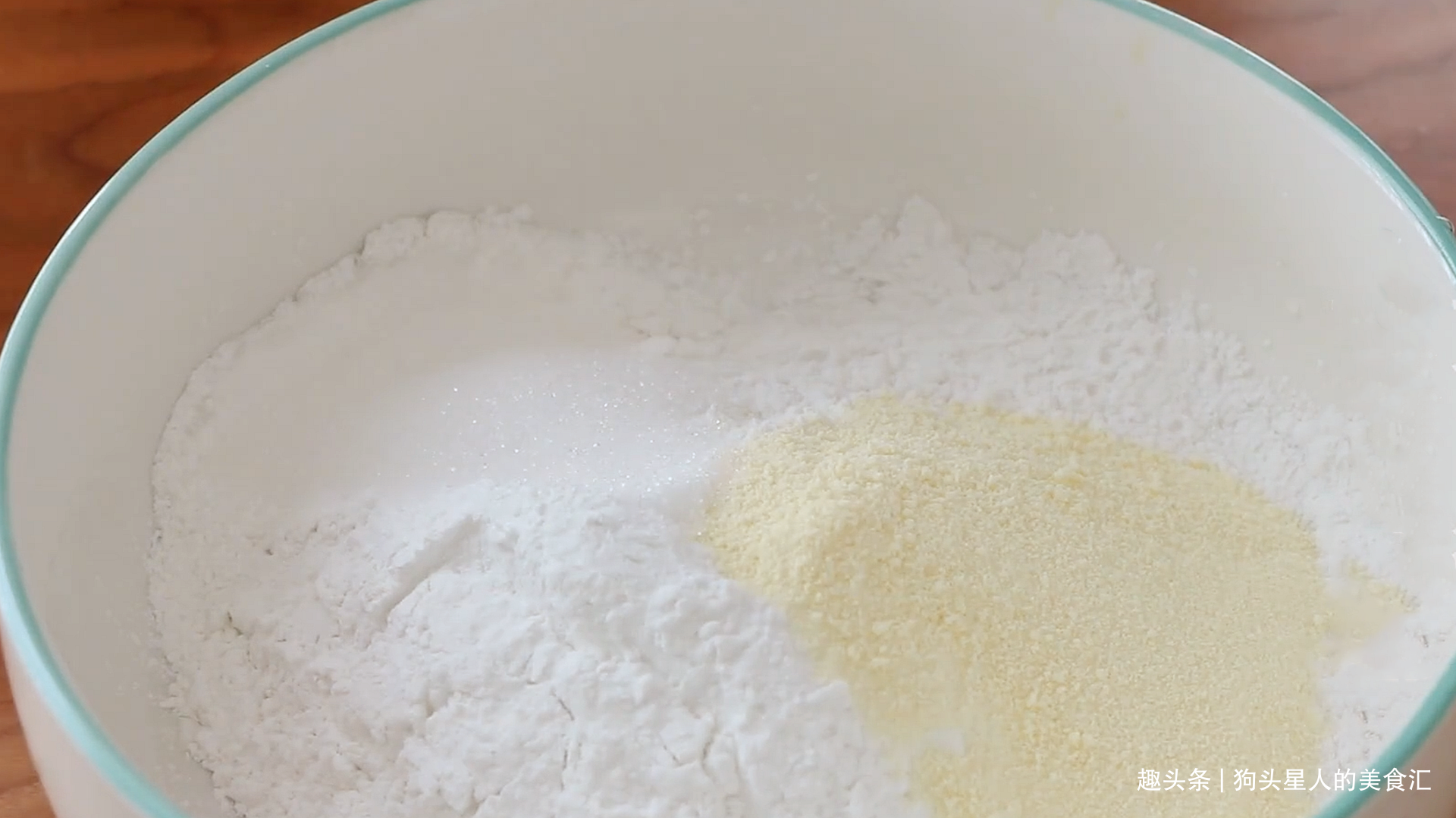 1.150克糯米粉,20克淀粉,20克奶粉,20克白糖放到一个碗中。没有奶粉的可以替换成糯米粉。淀粉是增加Q弹的口感,一定要加,玉米淀粉等都可以。