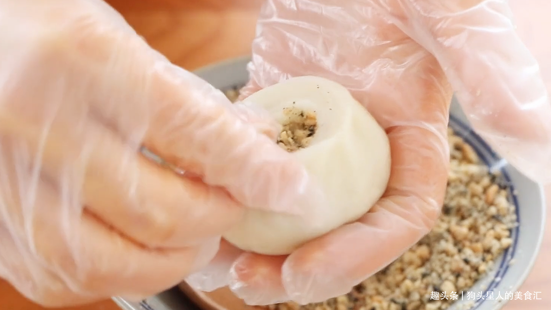 12.舀入馅料,像包包子一样封口。然后搓圆。