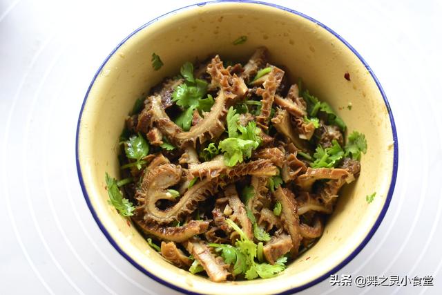 做法:卤牛肚切薄片加入香菜段和蒜蓉加入调料拌匀,腌制片刻即可。