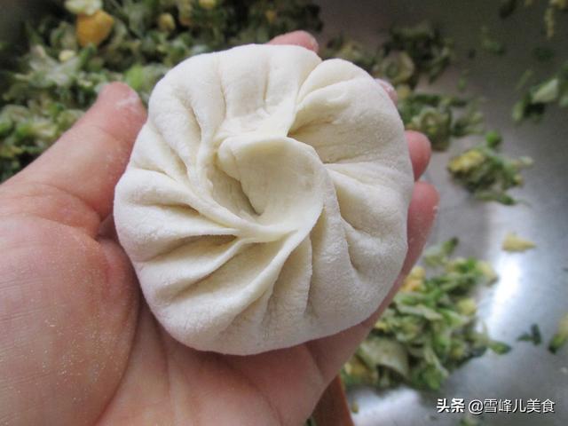 第六步:顺着边收口捏紧,包子就做好了,然后放到盖帘上,盖上湿布或者保鲜膜进行二次发酵,发酵到大约1.5倍到2倍大,手拿起来感觉轻飘飘的,就可以上锅蒸了。这样进行二次发酵的包子蒸出来包子皮才会特别暄软好吃。