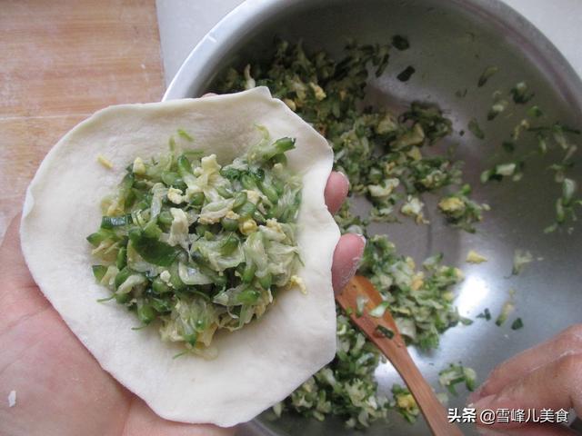 第五步:拿一个包子皮,把馅料放上,素馅可以多放一些会更好吃。