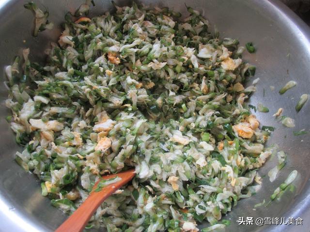 第三步:把鸡蛋炒成鸡蛋碎倒入盆里,加入葱末,姜末,盐,鸡精,花生油拌匀,就是纯纯的槐花包子馅了。