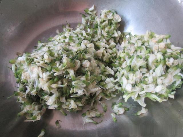 第二步:先把槐花稍微用开水汆烫,捞出放入冷水中过凉,捏干水分放到盆里。