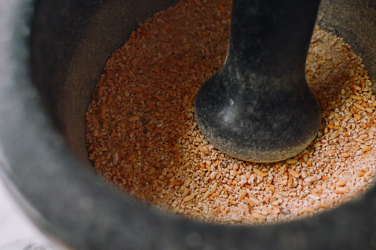 2 、在五花肉腌制的过程中,准备一口干净的炒锅,开火等待锅热之后,将准备的大米、花椒、糯米和八角放入锅中翻炒五分钟左右,直到大米粒变成浅棕色即可。让炒好的米冷却几分钟。
