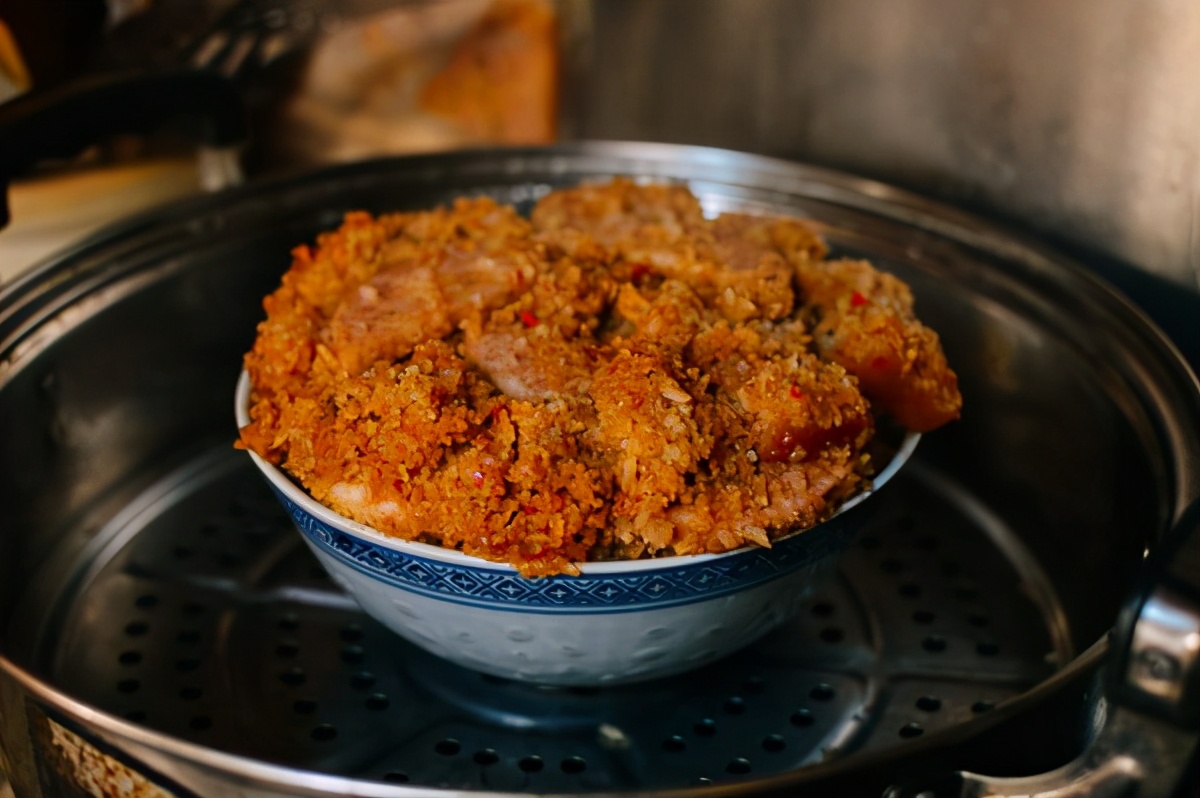 8 、等待上述时间之后,从锅中将粉蒸肉取出来,戴上一个耐高温的手套将粉蒸肉扣在一个盘子里,最后在上面撒上一些葱花即可。美味的粉蒸肉就完成了。