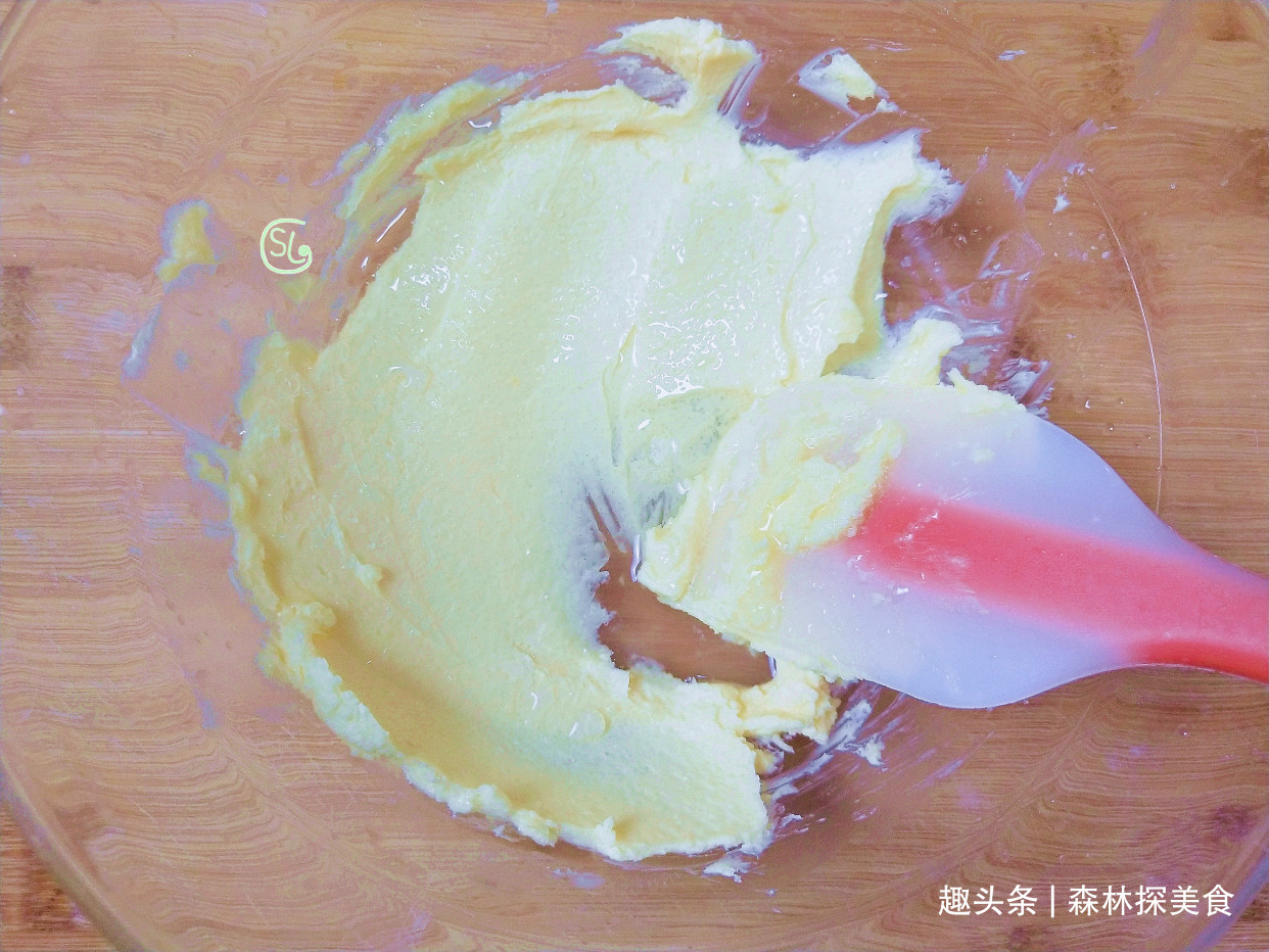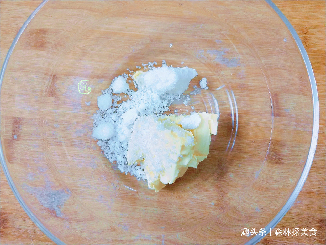 第1步,我们先在碗中加入65克软化至室温的黄油。然后再加入40克的白糖,用刮刀充分的翻拌均匀,翻拌至颜色一致。