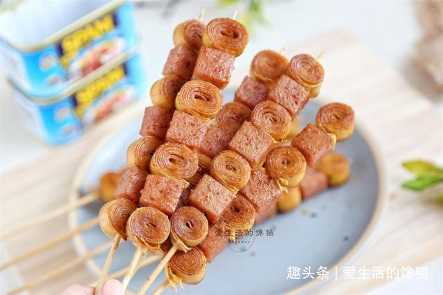 准备午餐肉1盒,豆皮2片,烧烤酱适量,辣椒粉适量,将午餐肉切成小方粒备用,豆皮清洗干净,先对折起来,卷成圆形,切成大约1CM宽度的片,一个午餐肉粒一个豆皮卷的间隔的串起来,刷上一层油,再刷上烧烤酱,烤箱提前预热一下,将串入烤箱170度烤5分钟,5分钟后取出再刷一层酱料,撒上辣椒粉,入烤箱烤5—8分钟即可。
