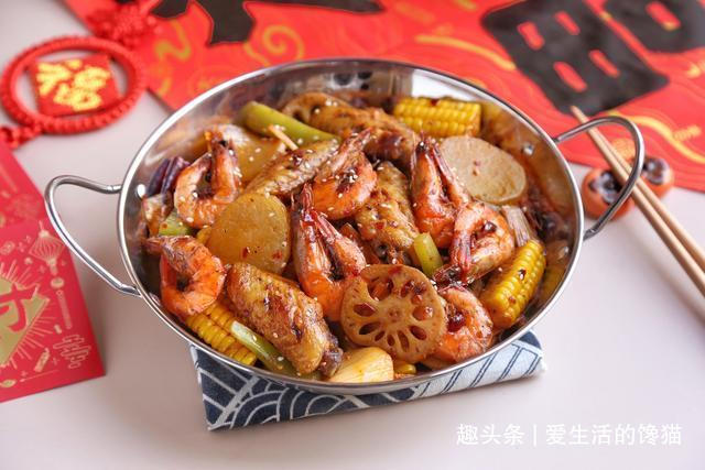 牛油老火锅底料100克,鸡翅8个,大虾400克,莲藕1节,甜玉米1个,莴笋半根,大葱半根,洋葱1/4个,大蒜4瓣,土豆1个,香菜适量,食用油适量,熟芝麻适量。虾抽出虾线,鸡翅洗净,切几个口子放入油锅里油炸,莲藕片,玉米,土豆等焯水备用,爆香大蒜,大葱和洋葱段,放入老火锅底料炒香,把鸡翅大虾倒入锅里炒均匀,最后把蔬菜都倒入锅里,翻炒均匀就可以出锅了。