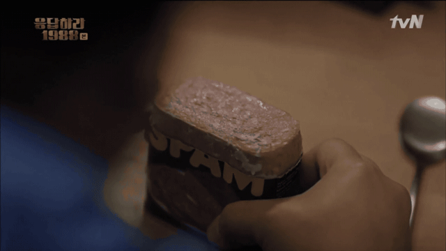 记得有一次看韩剧《请回答1998》,狗焕哥哥直接用勺子挖着一大块午餐肉放进嘴里。