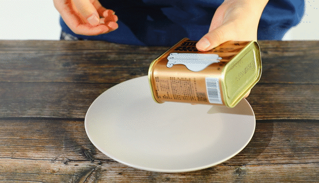 只需要将罐头倒立悬空,轻轻拍两下底部,午餐肉就自动滑落到盘子里了。