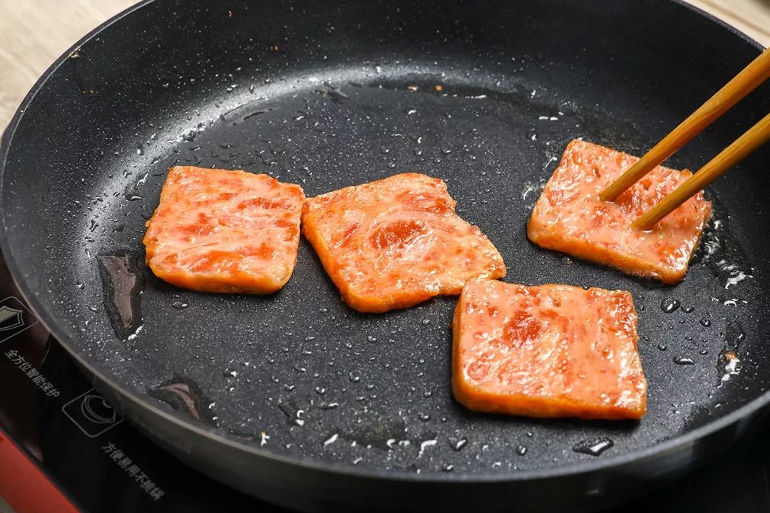 厚切的大片午餐肉,在热油中煎的滋滋直响,表皮酥脆、微微焦黄,浓郁的肉香被逼出.....