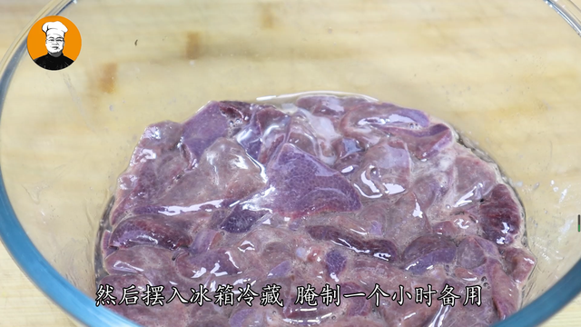 5、猪肝放入碗中腌制下,先放入少许食盐、白胡椒粉、少许料酒、半个鸡蛋清,用手揉抓均匀,再放入半勺玉米淀粉,再次抓匀,最后淋入少许食用油,防止猪肝粘连在一起,摆入冰箱冷藏腌制一个小时备用