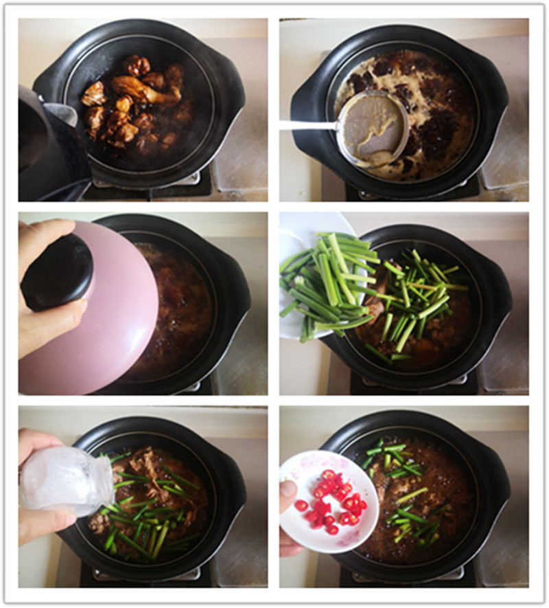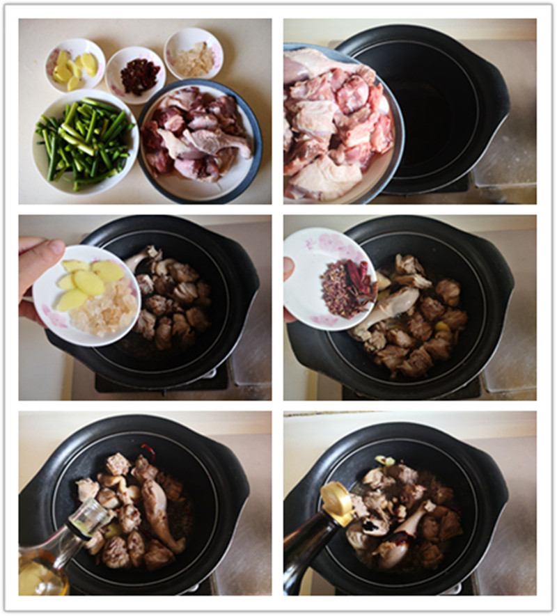 7. 加入适量的水炖煮; 8. 大火煮开后撇去浮沫; 9. 转为小火后加盖焖煮20分钟; 10. 加入蒜薹进锅翻炒均匀后继续焖煮5分钟; 11. 加入适量的胡椒粉和盐调味, 大火收汁; 12. 最后加入红椒翻炒均匀即可;
