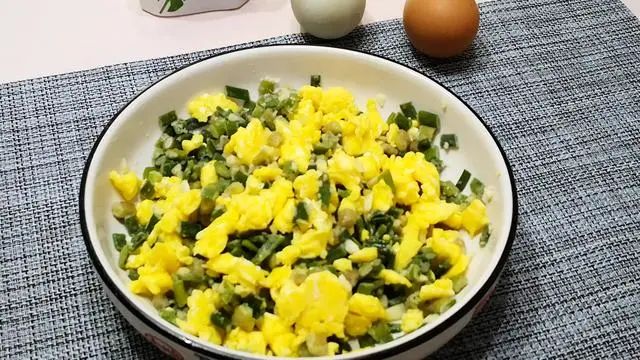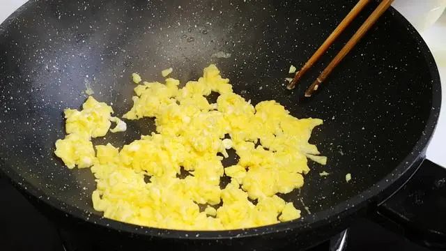3、碗内磕入2个鸡蛋,加一点盐增加底味,加几滴醋去腥,加几滴水这样煎制出来的鸡蛋会更加的软嫩,然后顺着一个方向打散。锅内加油,倒入蛋液,用筷子不停地搅动,使之成为均匀的小块,定型后盛出备用。