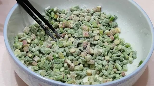 1、洗净的蒜苔尾巴切成小段,然后开始调味,加入1勺盐,适量的胡椒粉,然后搅拌均匀,搅拌均匀后分少量多次地加入面粉,叫每一蒜苔都均匀的挂上面粉。