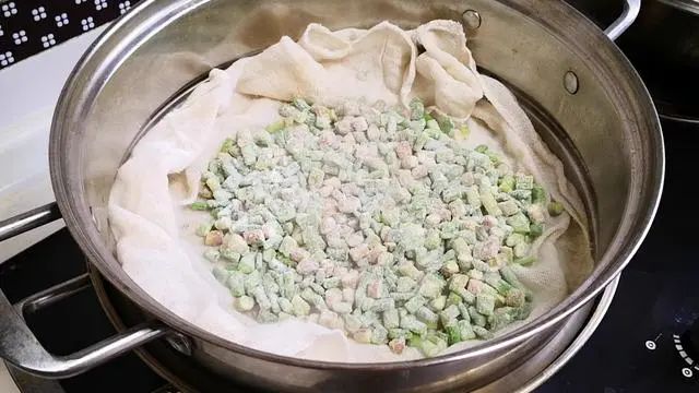 2、蒸锅内加水,然后放入打湿的笼布,大火烧开后倒入抖散的蒜苔,大火蒸8分钟。先把打湿的笼布烧开目的是蒸蒜苔时不粘连。